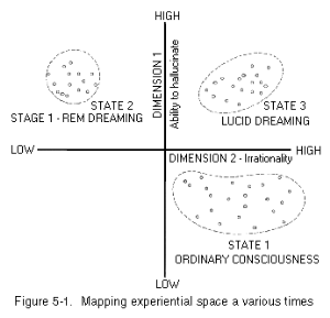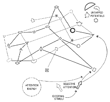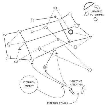 Figure 5-3. Representation of a d-ASC as a reorganization of information and energy flow pattern and an altered selection of potentials. The b-SoC is shown in lighter lines. |