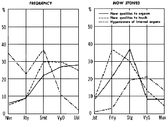 More Drug Experience | More frequent: Actions become archtypal New smell qualities Faces change Vision sensual More need for sex if sitution appropriate Closer to partner | Less intoxicated for: Vision sensual More need for sex Closer to partner |